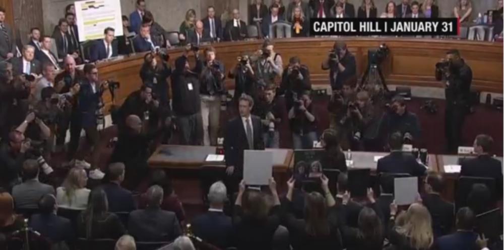 現場受害者及其家屬舉著照片起立示意,扎克伯格起身轉向這些聽眾,他身后的媒體記者一擁而上拍下這一幕。