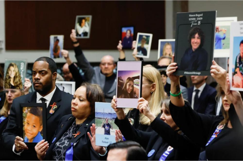2024年1月31日,在美國國會參議院司法委員會舉行的關于網絡兒童安全問題的聽證會上,聽眾舉著照片和標語。圖自美媒