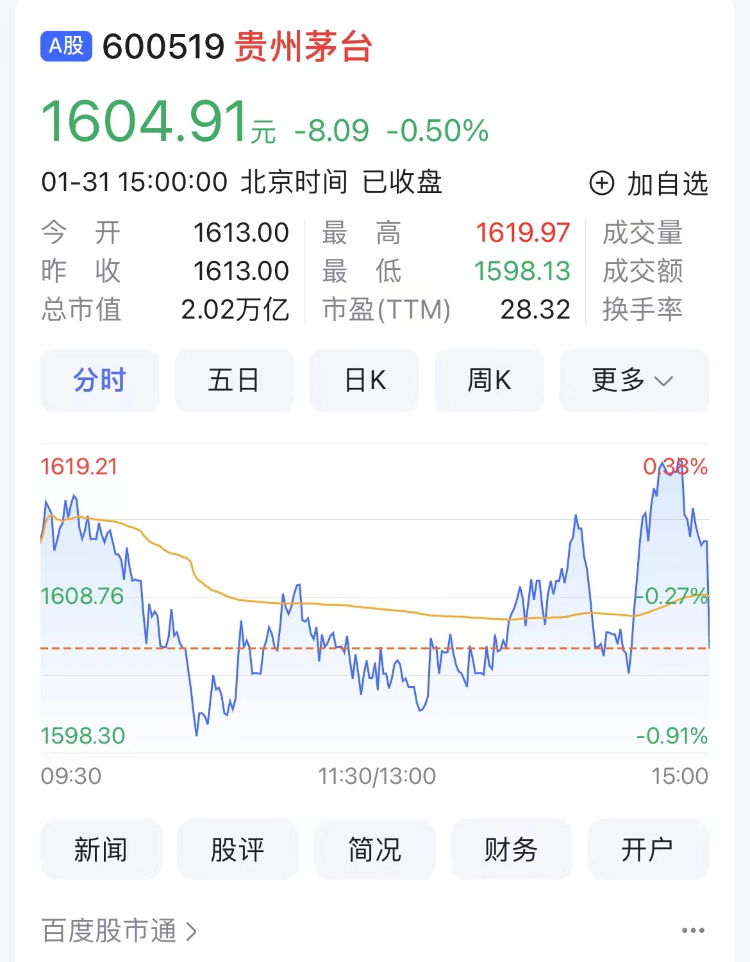 作為白酒“一哥”,貴州茅臺1月31日收盤股價1604.91元,下跌0.50%,動態市盈率28.60,換手率0.24%,成交量296.49萬股,成交額47.70億元,總市值20,160.84億元。