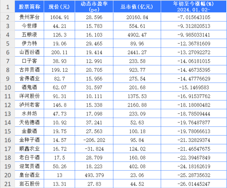 據同花順數據,自2024年1月2日起至1月31日收盤,20家白酒A股無上漲企業,均為下跌企業。