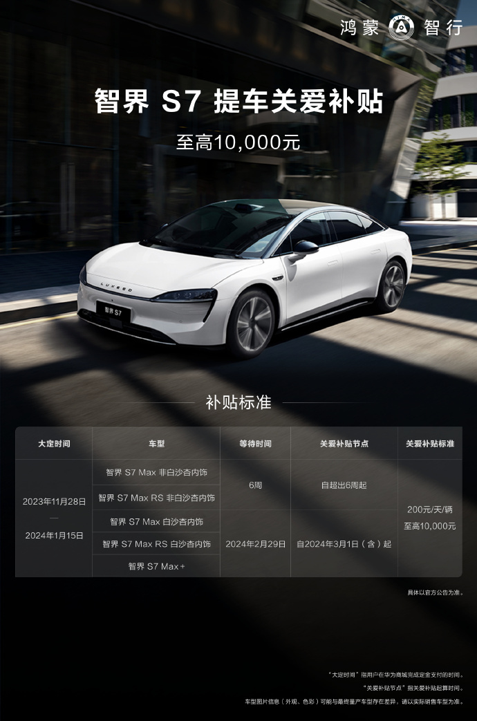 針對2023年11月28日-2024年1月15日下定的智界S7用戶,若智界S7的交付時間超過6周,或在2月29日后,每位用戶將獲得每輛車200元/天的現金補貼,最高補貼1萬元。