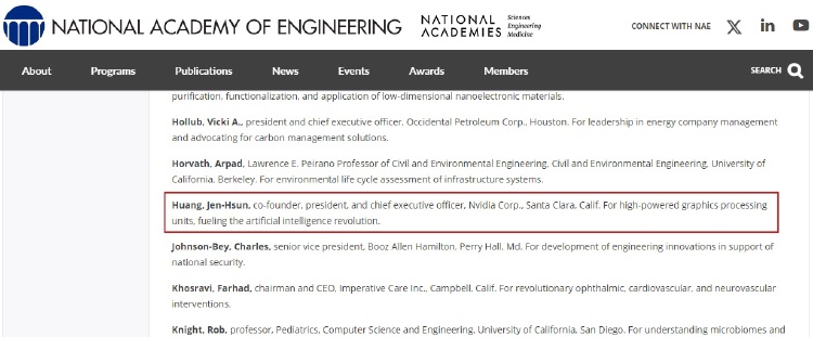 每日經濟新聞消息,據美國國家工程院網站,作為美國工程師最高榮譽之一,今年(2024年)共新增114 名新院士和 21名國際院士。其中最受矚目的,莫過于英偉達創始人兼CEO黃仁勛(Huang, Jen-Hsun)。