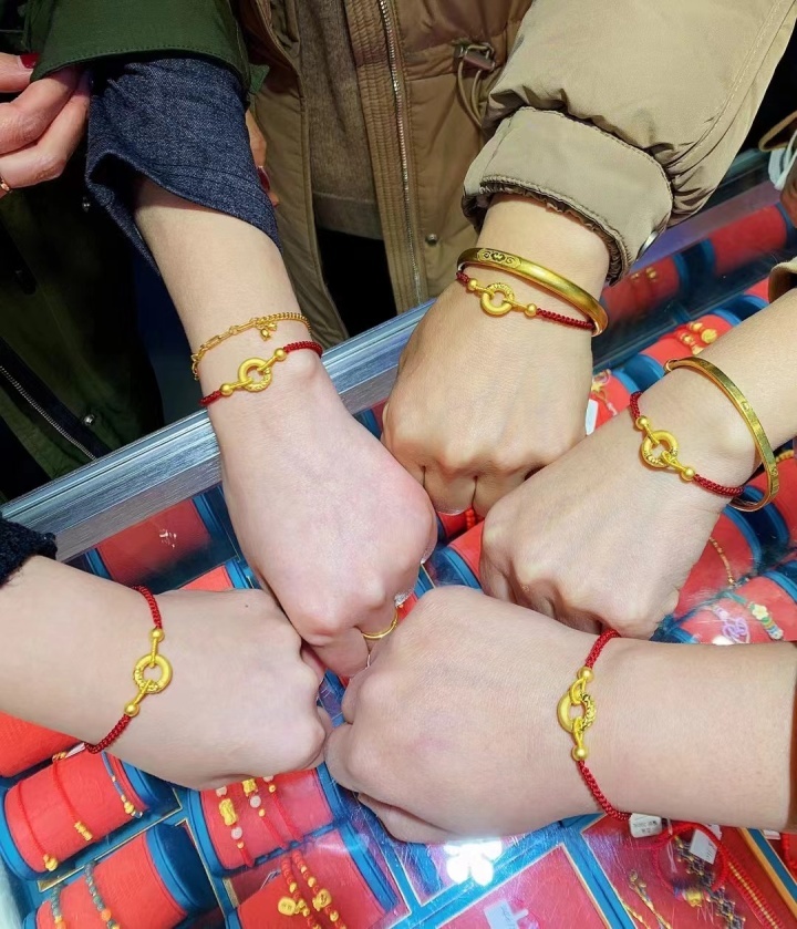 在蕭山區(qū)一家金店,五位“75后”閨蜜相約來(lái)店里。看了一圈后,她們每人買(mǎi)了一個(gè)黃金平安扣。“我們是40年的老閨蜜了,過(guò)年了,一起買(mǎi)個(gè)平安扣圖個(gè)平安吉祥的好寓意!我們剛剛討論過(guò),明年每人買(mǎi)條黃金掛墜。”其中一位女士說(shuō)道。