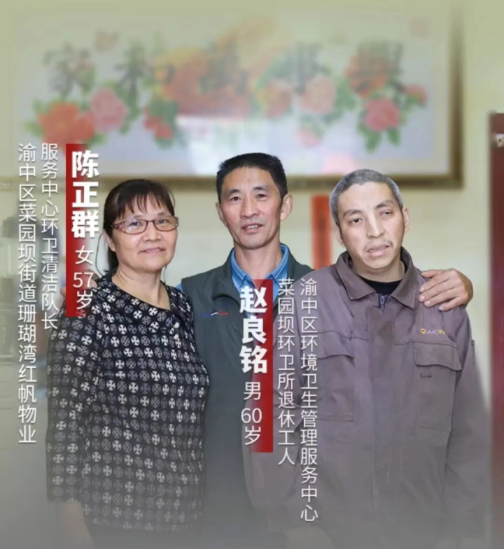 陳正群,女,57歲,群眾,渝中區菜園壩街道珊瑚灣紅帆物業服務中心環衛清潔隊長;趙良銘,男,60歲,群眾,渝中區環境衛生管理服務中心菜園壩環衛所退休工人。
