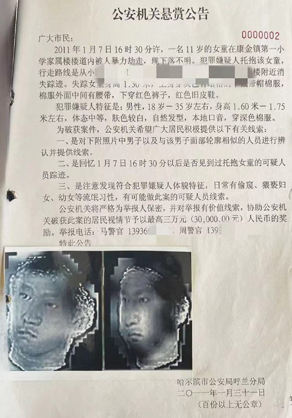 澎湃新聞注意到,事發后,當地警方曾發布《懸賞公告》稱,小燕在樓道內被人暴力劫走,下落不明,協助警方破獲此案的居民可視情節予以最高3萬元獎勵。