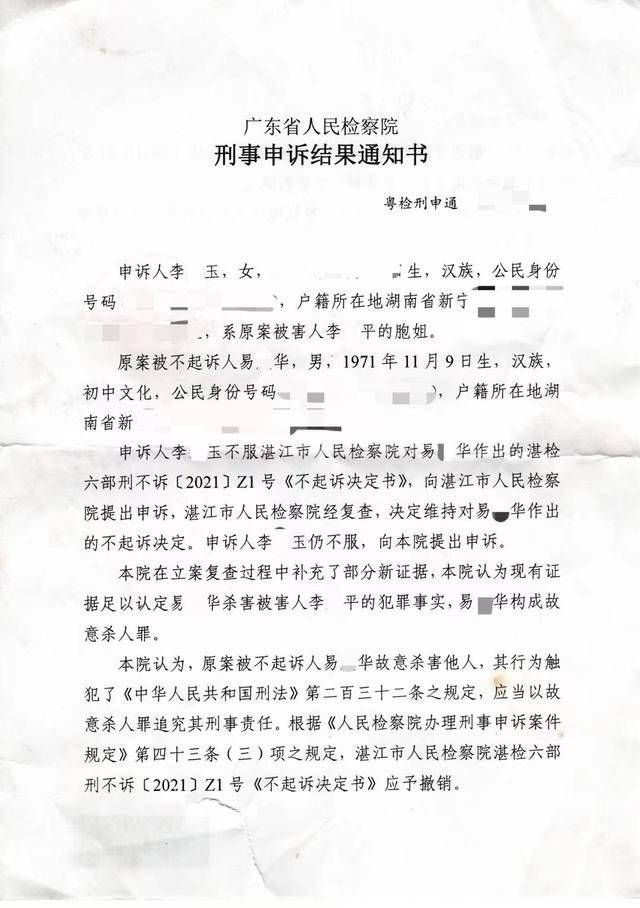 2022年11月,廣東省人民檢察院出具的《刑事申訴結果通知書》顯示,該院在立案復查過程中補充了部分新證據,該院認為現有證據足以認定易某華殺害李煥平的犯罪事實,易某華構成故意殺人罪,決定撤銷此前《不起訴決定書》,將案件移交湛江市人民檢察院依法層報最高人民檢察院核準追訴。