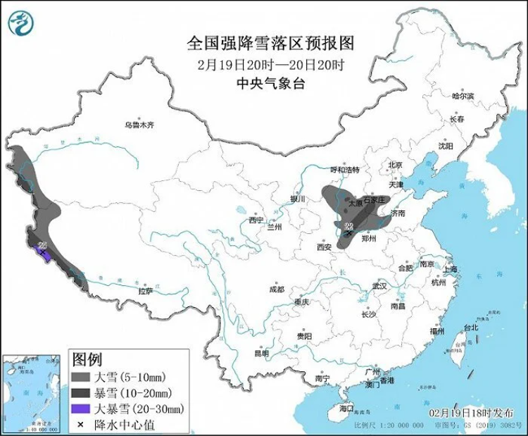 中央氣象臺(tái)2月19日18時(shí)發(fā)布暴雪藍(lán)色預(yù)警:預(yù)計(jì)2月19日20時(shí)至2月20日20時(shí),陜西北部、山西中南部、河北南部、河南北部、山東西部、新疆南疆西部、西藏西部等地部分地區(qū)有大到暴雪,其中,河南西北部、西藏西部等地局地有大暴雪(20~25毫米)。上述部分地區(qū)新增積雪深度3~5厘米,局地可達(dá)10厘米以上。