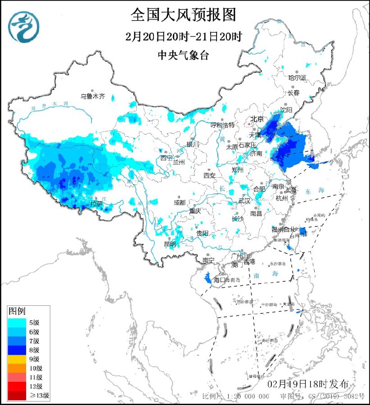 中央氣象臺(tái)2月19日18時(shí)繼續(xù)發(fā)布大風(fēng)藍(lán)色預(yù)警:預(yù)計(jì),2月19日20時(shí)至20日20時(shí),西藏中西部、青海中南部、內(nèi)蒙古中西部、遼寧南部、華北東部、黃淮西部和東部、江淮西部等地的部分地區(qū)有5~7級(jí)風(fēng),陣風(fēng)8~9級(jí)。渤海、渤海海峽、黃海大部海域?qū)⒂?~8級(jí),陣風(fēng)9~10級(jí)的大風(fēng)。