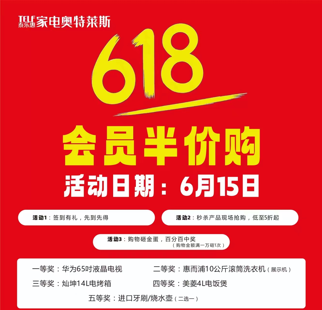 作為今年618”的重點暖場活動, 615日周六,家電奧特萊斯推出會員日半價購活動,到店就有禮,購物砸金蛋百分百中獎,獎品包括華為65時液晶電視、燦坤14L電烤箱、美菱4L電飯煲等。