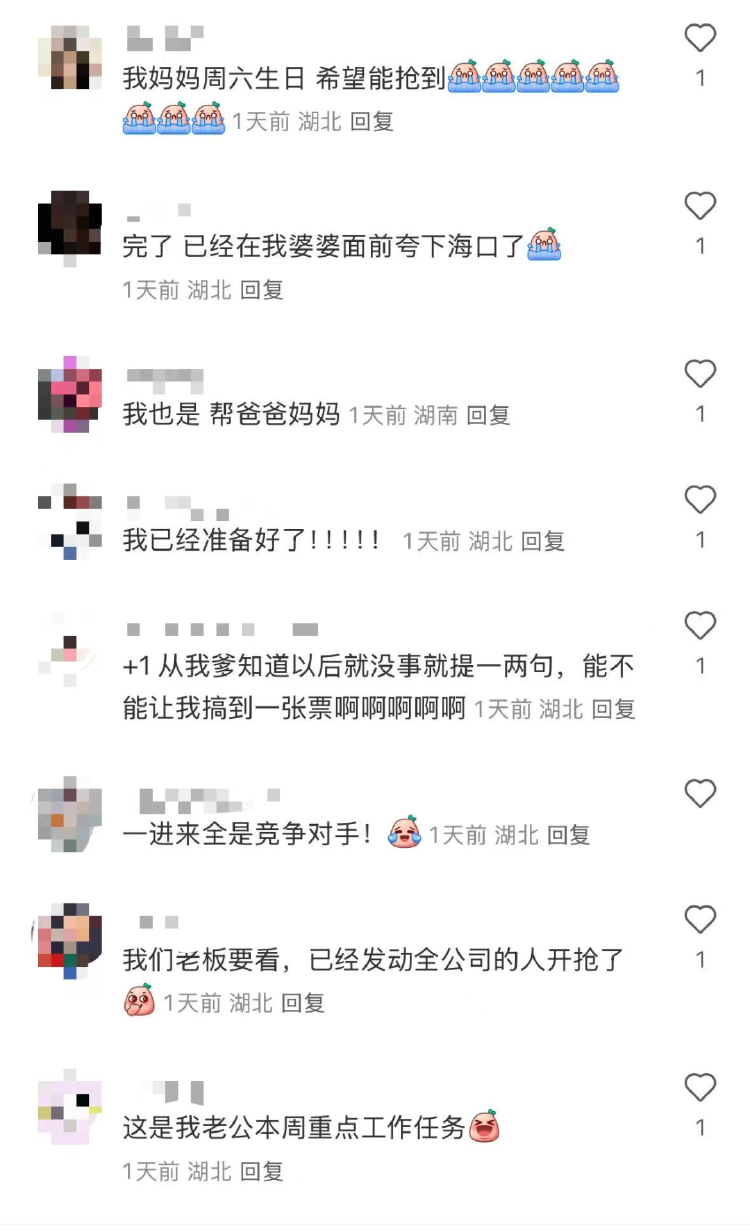 在評論區,有人期望網友別和自己搶一個檔位,有人分享自己此次“重任在身”。有幫爸媽搶的,有幫丈夫搶的,有想作為生日禮物送長輩,也有長輩首次提出要求想去。不過,等開票結束后,評論區更多的是沒搶到票的“哀嚎”。
