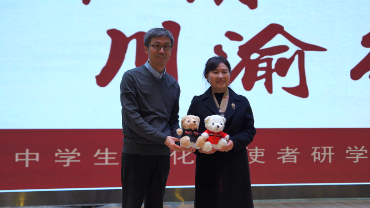 隨后,北師大實(shí)驗(yàn)中學(xué)順義學(xué)校學(xué)生教育指導(dǎo)中心主任、線路領(lǐng)隊(duì)老師余勇濤和巴川量子學(xué)校黨總支書記、校長(zhǎng)潘云芬互贈(zèng)代表深厚情誼的“校服熊”,寓意兩校之間的研學(xué)交流將開啟新篇章。重慶市文化和旅游發(fā)展研究會(huì)會(huì)長(zhǎng)、成都天府文化研究院學(xué)術(shù)委員李永明,新鷗鵬教育集團(tuán)董事長(zhǎng)杜積西,北京青年報(bào)社中學(xué)時(shí)事報(bào)執(zhí)行主編薛靜為北師大實(shí)驗(yàn)中學(xué)順義學(xué)校的學(xué)生頒發(fā)“文化小使者”證書。