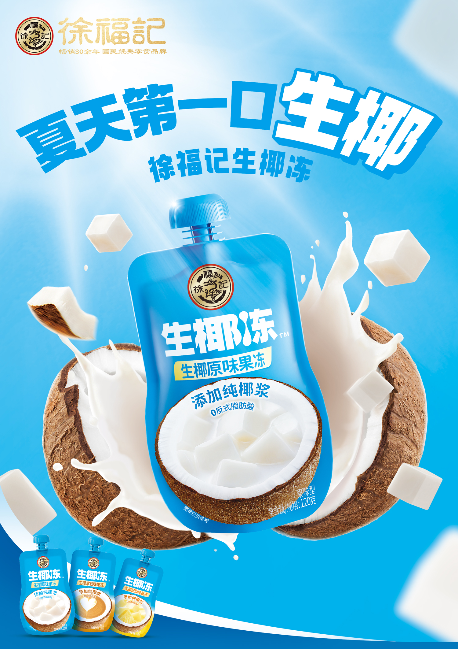 徐福記從30年前就入局果凍市場,推出的第一款果凍就是椰果果凍。今年實現針對“椰”的果凍技術創新的突破,研發出首款生椰凍。