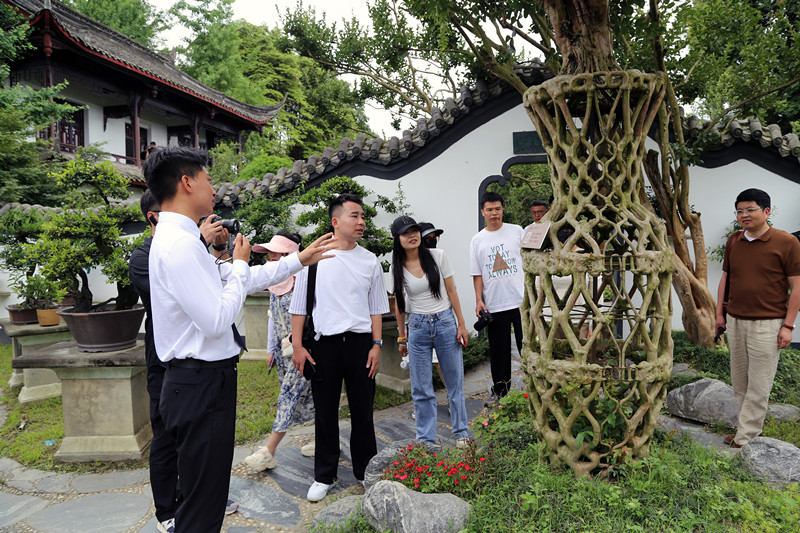 從花卉園到三邑川派盆景博物館,一路仿古建筑,小橋、流水、廊亭,仿佛進入了古風園林。一件件造型各異的世界精品盆景和溫江特色花木錯落有致地擺放著,方寸之間見天地,吸引大家駐足拍照打卡。